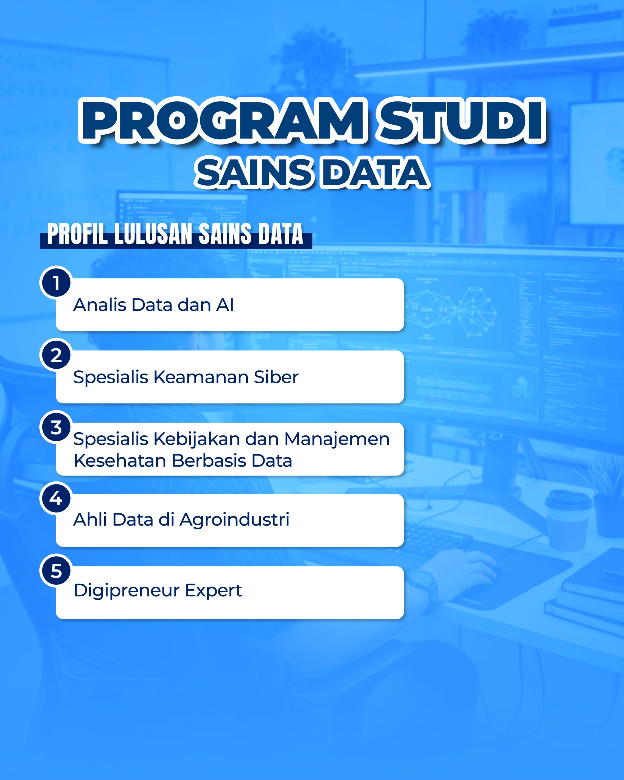 - Menghasilkan penelitian dan pengabdian kepada masyarakat yang berkontribusi terhadap ilmu Sains Data dan Digipreneur.